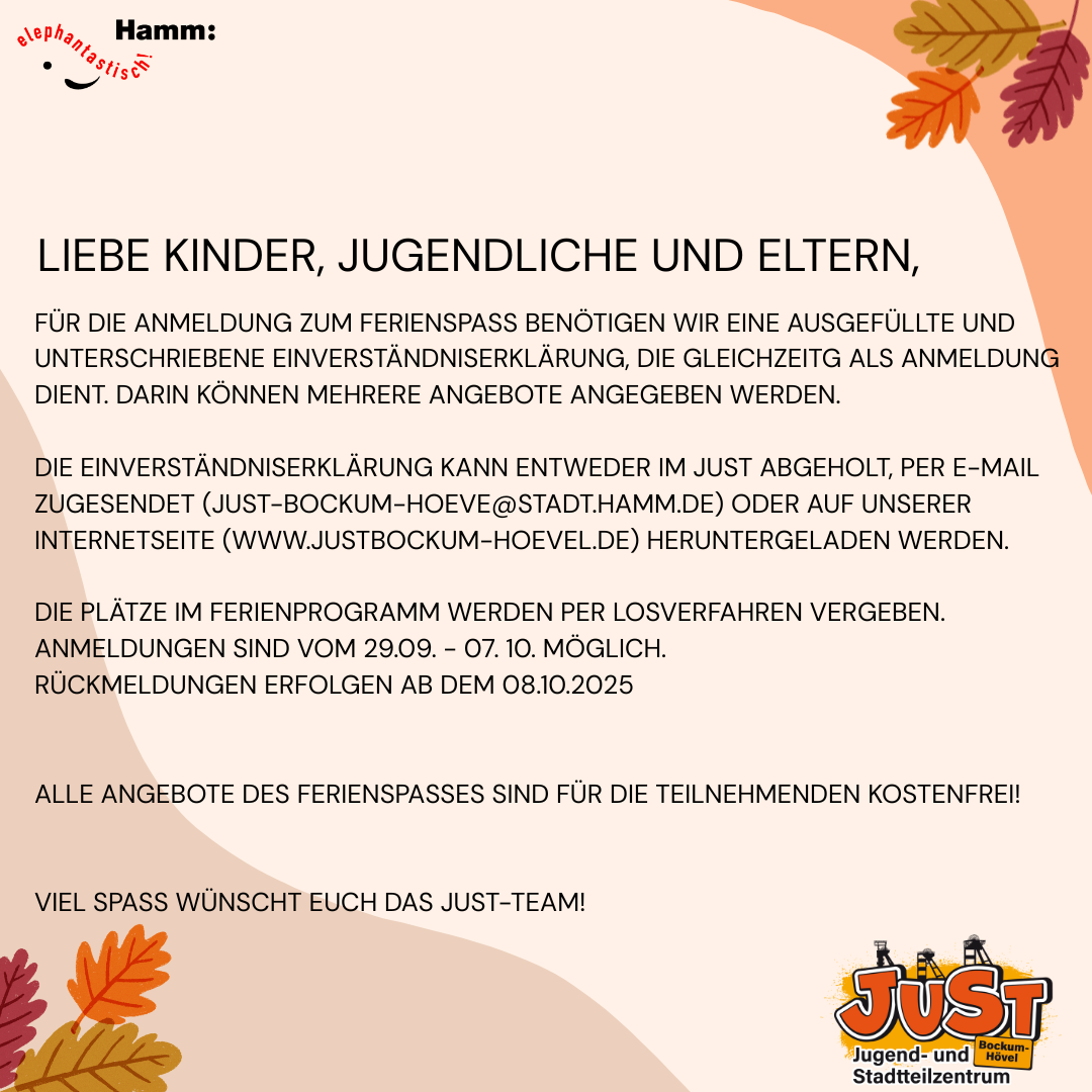 Die Einverständniserklärung kann entweder im JuSt abgeholt, per E-Mail ( Just-Bockum-Hoevel@Stadt.Hamm.de ) zugesendet oder unten auf dieser Seite heruntergeladen werden.